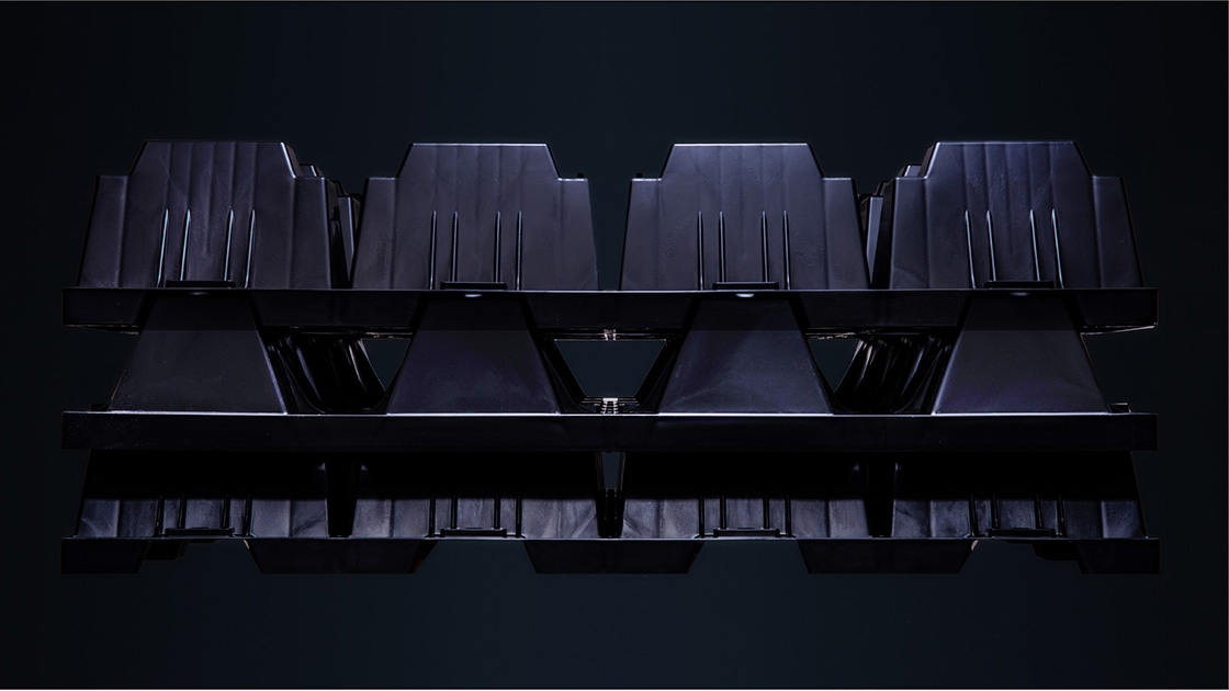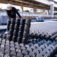 従来の貯留層はクレーンなどの重機を使って設置しなければなりませんでした。それに比べて『アクアロード』は軽量なので、人の手でも運べます。設置の時も人力で積み上げていくことができます。工期も断然短く、抜群の施工性なのです。さらにスタッキングできるので、コンパクトにして輸送できます。